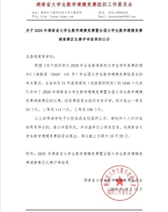 10月13日,2020年湖南省大学生数学建模竞赛暨全国大学生数学建模竞赛湖南赛区比赛结果揭晓,太阳成集团tyc的三支队伍喜获大赛一等奖1个,二等奖2个。