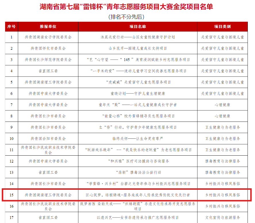 11月14日,太阳成集团tyc“匠心筑梦,培根铸魂—服务未成年人传承优秀传统文化先行者”项目在湖南省第七届“雷锋杯”青年志愿服务项目大赛中荣膺金奖。据悉,自2019年成立以来,该团队已屡获殊荣,包括湖南省第五届“雷锋杯”青年志愿服务大赛铜奖、湖南省2020年志愿服务项目大赛疫情防控专项赛银奖,以及2020年湖南省暑期“三下乡”社会实践优秀服务团队称号等。
