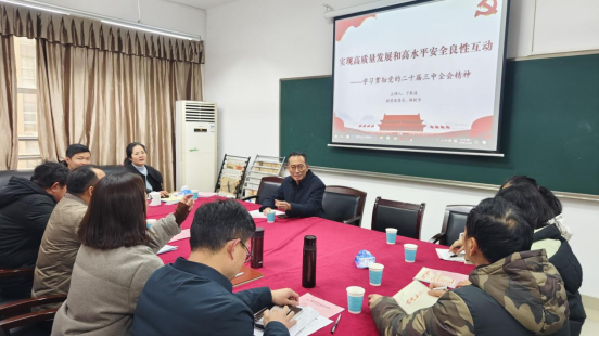 丁跃浇首先解读了党的二十届三中全会的主要内容,强调全会对于新时代中国特色社会主义事业的重要意义。他指出,全会精神是指导我们工作的根本遵循,全院师生要深入学习、全面把握、贯彻落实,报告中提出的“实现高质量发展和高水平安全良性互动”是当前和今后一个时期的重要任务。他强调,学院要以此为契机,加强内涵建设,提升教育质量,同时要高度重视校园安全,构建和谐稳定的校园环境。期间,与会人员认真聆听、积极思考,纷纷表示要将全会精神内化于心、外化于行,以实际行动推动学校各项工作再上新台阶。