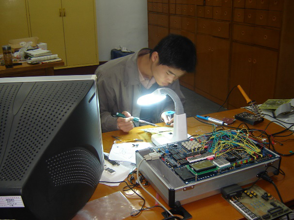 10)电气及自动控制工艺实习基地:电气及自动控制工艺实习基地主要实验设备有电子工程开发箱、示波器、函数信号发生器、稳压电源、各类仪表、回流焊片机、程控曝光机、化学沉铜等。主要承担电子电工实习教学、相关控制类课程设计和毕业设计,学生利用电子工程开发箱进行开发设计,启迪创新思维。