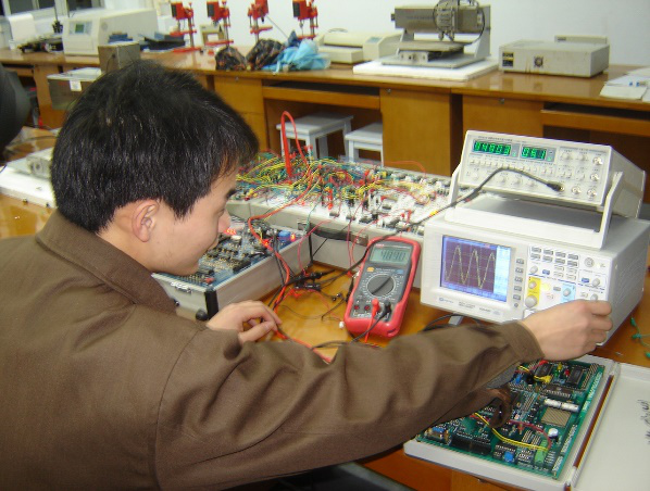 1)电工技术实验分室:电工技术实验分室主要承担“电工原理”、“电工与电子技术”等课程的实践教学。主要实验设备有电路分析实验箱、三相电路实验板、电机控制实验板、函数信号发生器、稳压电源、交直测量仪表,实验为电路理论和三相强电两个部分。学生通过独立操作实验,增加了感性认识,培养学生分析问题解决问题的能力和动手能力,为后续课程的学习奠定了基础。