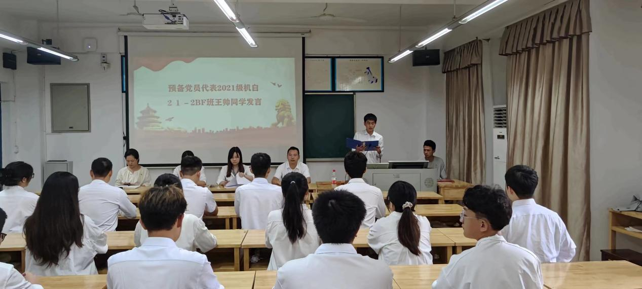 宣誓结束后,预备党员代表王帅同志进行发言。他表示自己受到了一次深刻的党性教育,并代表全体参加入党宣誓的新党员郑重承诺,览前贤思己任,艰苦奋斗,只求实现自身价值,为国家敢感恩,尽职尽责。