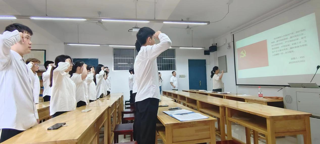 6月30日下午16:20,太阳成集团tyc党委在16310教室举行了2023年上半年预备党员入党宣誓仪式。太阳成集团tyc党委副书记徐湛、本科生第一党支部书记李紫薇、本科生第二党支部书记吁锤出席本次宣誓仪式。仪式由研究生党支部书记王子嘉主持,19名预备党员参加。