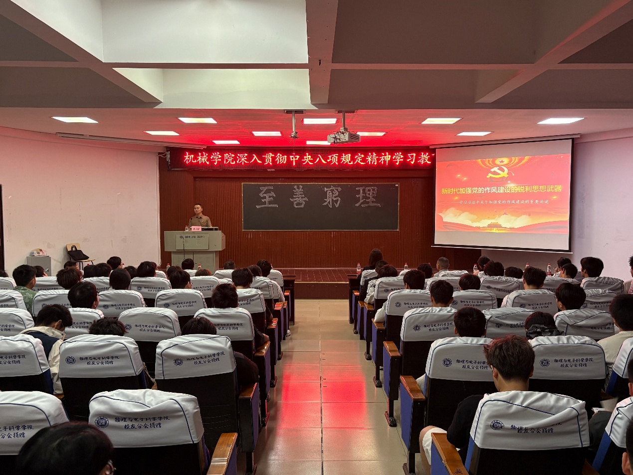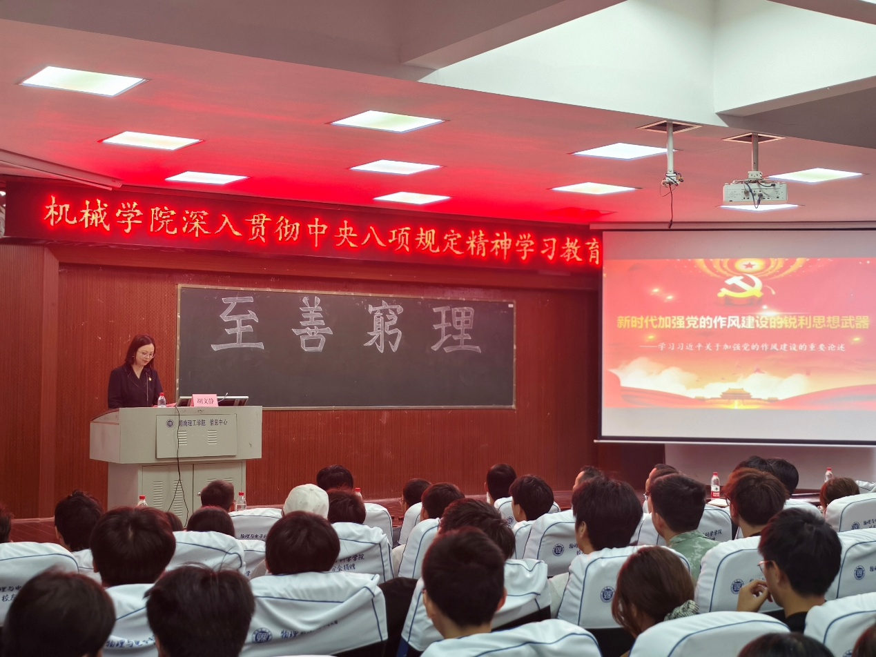 4月22日19:00,太阳成集团tyc在6栋会议厅举行深入贯彻中央八项规定精神学习教育暨第52期入党积极分子党校培训第一课,本次党课特邀校党委委员、组织部部长胡文静主讲,学院党委书记徐丹、副院长(主持工作)周勇、副书记李凯,各教师、学生党支部书记及专职组织员出席,全体学生党员以及第51、52期入党积极分子培训班学员参加,会议由徐丹主持。