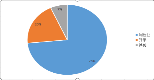 从图1可知,我院2018届毕业生从事制造业的学生大约占到73%左右,从事其他行业的大概占了7.00%,升学(考研52人)占20%。这说明大部分学生基本上找到了与专业相匹配的工作,还有一部分学生以追求更大的发展空间和潜力选择继续深造,还有7%的学生选择个性化的就业道路,来快速有效实现自己的人生理想。