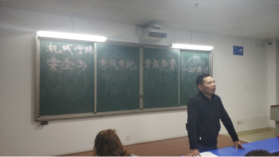 李紫薇老师讲话内容主要包括党建工作及有关毕业生的就业问题。她强调党建工作要诚信,必须实事求是,不能谎报。李老师也提及了毕业生的应聘条件,希望大家能认真地学习专业知识,成为一个有真才干、真本领的人。王子嘉老师主要强调了考风考纪的问题,针对学生考试中出现的五大问题,并提出了两点要求。她强调要加强学风建设,要求各班召开班会,为同学们营造更好的学习氛围;并希望班干部多做工作提高同学们的纪律意识。刘尘轩老师主要讲述了有关征兵及党员发展方面的问题。他简要地介绍了征兵的方式、当义务兵的福利及应征入伍后未来的规划,并支持有想法的同学来找他报名。随后,刘老师又介绍了有关本学期党员发展的注意事项。吁锤老师主要针对本期学生的寝室文明、校园文化建设等重点工作、等。吁老师要求大家学习党的十九大精神,积极开展团课。他还鼓励大家积极参加机械创新节、校园文化节、暑期三下乡等活动,以此来提高自己。此外,吁老师还提及了同学们的心理健康问题,希望大家多多关注身边同学们的心理健康。蔡奕老师最后发表讲话重点强调安全,并用历年来安全事故作为典型案例来告诫同学们要随时注意安全;她要求班委要着重加强班级建设,增强班级凝聚力;强调学生干部要学会合理安排时间,注重能力的培养。
