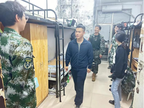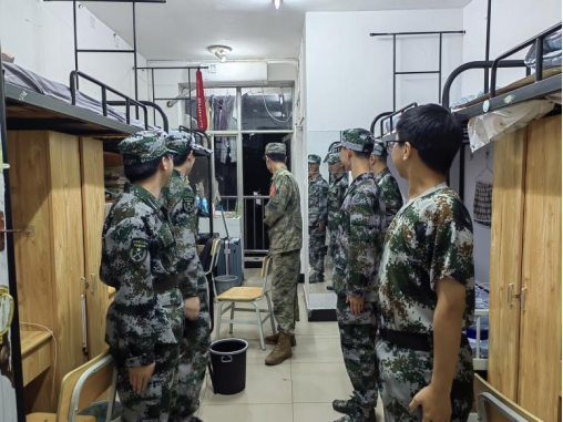 晚上下训后,辅导员、带训教官以及各班助班深入寝室,细致入微地检查卫生情况,并强调内务整理的重要性。