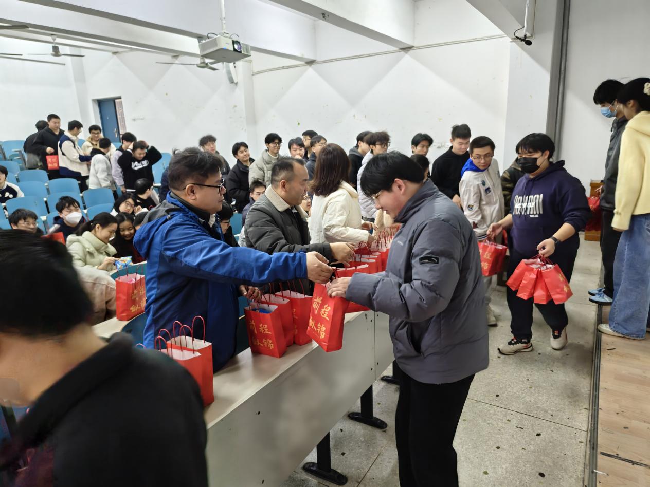 现场还为考研学子们送上了精心筹备的“考研慰问礼包”。礼包内不仅有寓意“前程似锦”的定制礼品袋,更有补充能量的士力架、薯片,驱散寒意的暖宝宝,以及象征“心想事成”的橙子等贴心好物。每一份慰问品都承载着学院对学子们的深切关怀与美好期许,让寒冬中的备考之路暖意融融,也让同学们感受到了来自学院大家庭的强大支持与温暖力量。