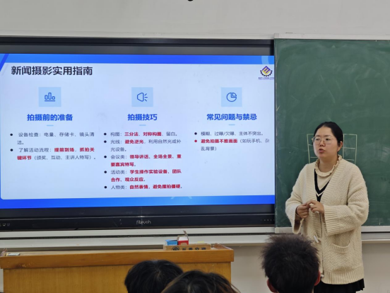 在摄影技能培训环节,王荣荣结合丰富的图片实例,深入浅出地讲解了摄影的基本构图原则,如三分法、对称式、前景衬托等。她特别强调了新闻摄影的新闻性和故事性,要求同学们在拍摄时不仅要关注画面的美感,更要考虑如何通过照片传达新闻事件的核心内容和情感。参训同学专注记录,围绕新闻策划与镜头语言展开热烈讨论。