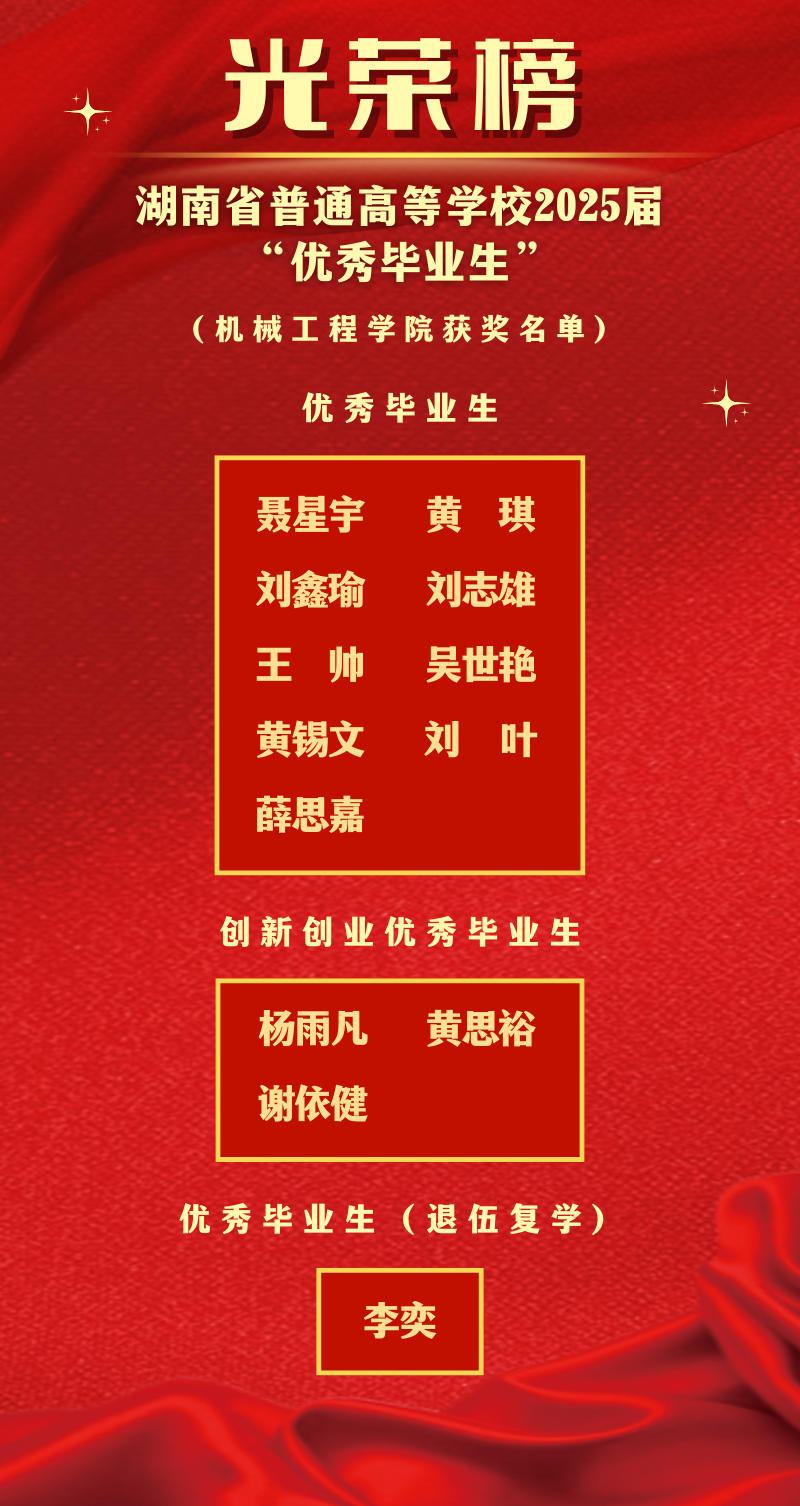 优秀毕业生是学院学子中的杰出代表,他们在求学时光里,不仅深耕机械设计、智能制造、工程实践等专业领域,以优异成绩筑牢知识根基,更在学科竞赛、科研项目、社会实践中勇挑重担——从攻克机械结构优化难题,到参与智能制造系统调试;从在省级创新大赛中斩获佳绩,到走进企业一线完成实习攻坚,始终以 “严谨、务实、创新” 的机械精神,诠释着新时代工科生的责任与担当。这份荣誉,是对他们数年寒窗苦读的最高认可,更是对他们扎根实业、服务国家制造事业的殷切期许。