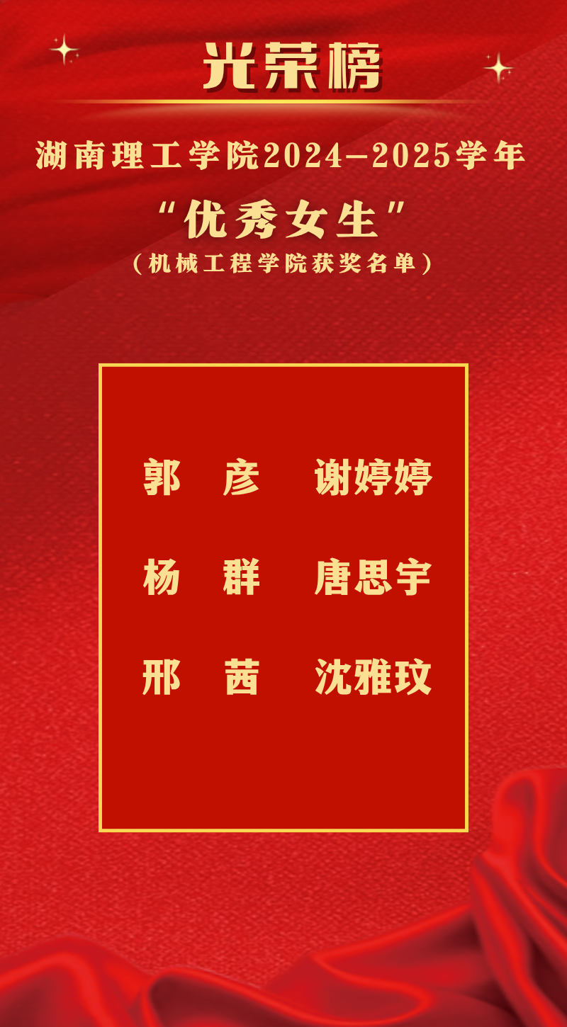 在机械学院的实验室里,在图纸与代码交织的课堂上,活跃着一群不让须眉的优秀女生。她们打破“机械领域是男生主场”的刻板印象,以扎实的专业功底叩击知识大门,用坚韧的探索精神突破技术壁垒。无论是在读懂复杂的机械原理过程中,还是在实验难题的攻克途中,她们始终以青春为笔,以奋斗为墨,将对机械学科的热爱,书写成逐梦路上的生动篇章。机械君带领大家一起看看2024-2025年度太阳成集团tyc的优秀女生吧!