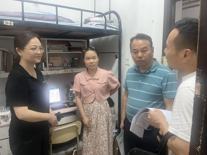 走访过程中,徐丹、周勇和同学们亲切交谈,详细了解大家的职业规划、就业去向、毕业论文进展等方面情况,鼓励同学们根据自身实际树立理性的择业观和就业观,调整心态和期望值,积极主动参加招聘会,实现平稳毕业、顺利就业。张敬表达了对毕业生的关怀,心系学生的成长与发展,结合专业学习、学科考赛为同学们进行指导,并提出具体期望与要求。李凯向同学们传达和强调了学院针对宿舍安全管理方面的规章制度,提醒大家要严格遵守宿舍消防安全和卫生管理规定,共同营造安全、和谐、温馨的寝室环境。