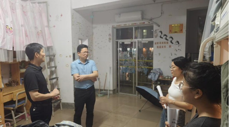 为了解毕业生学习、生活和就业情况,加强毕业季安全管理,持续推进“七进两联系”工作,5月21日21:30,我院党委书记徐丹、副院长(主持工作)周勇、副院长张敬、副书记李凯、辅导员等老师深入走访毕业班学生宿舍。